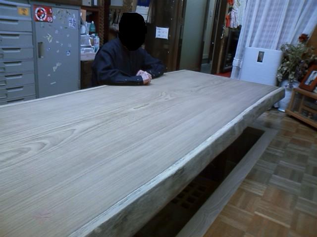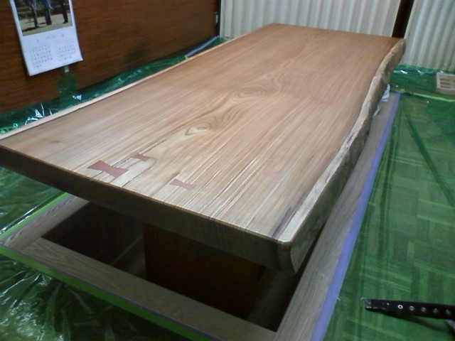塗装前の天板ですが、ウレタン塗装を 施すと濡れ色になり、何とも言い難い 木目が浮き出るような素晴らしい仕上がりに なります。 |