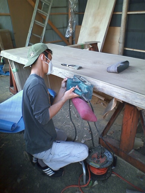 加工はベルトサンダーを使い荒木の状態から徐々にロール上のペーパーサンダーの粗さを80/120/150/240と変えていき 小口面から皮面の細部に至るまで、 ツルツルに仕上げていきます。 根気のいる作業ですが、ここが塗装後の 天板の仕上がりに直に影響するので しっかりとしておきます。 |