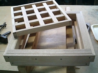 | 足を入れる彫り込みのもう一段したにある コンロを仕込む彫り込み部には 無垢のナラ樫を組み格に仕上げ 重厚葛品の有るできばえになりました。 |