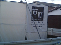 | 養生シートには 鮫島浩工務店のこだわり 「古材」の文字。 |
