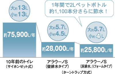 ![]() アラウーノSは、 小洗浄が4.5L/回から4L/回になりました。 ※壁排水タイプの場合は洗浄性能確保のため約4.5Lになります |